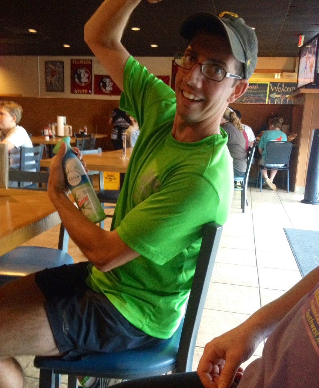 Post-race, a group of us went out for a bite to eat. And there were some who did not bring a change of clothes. Fortunately our friend Patty was prepared for such an occasion, and carried with her a can of Febreze. Ross (shown here) and a few others decided not to subject the other patrons to our funkiness, and doused ourselves in Febreze's 'Gain' laundry detergent scent instead. #DontJudge