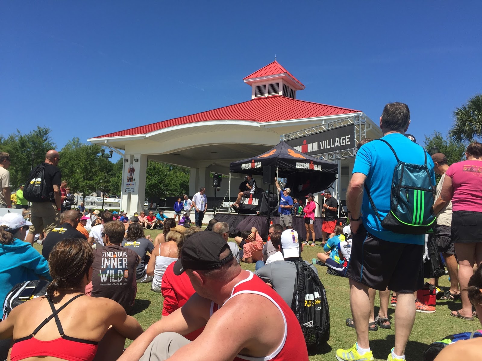 Saturday morning we headed to the park.  Ironman Village was an outdoor expo. There was a stage, a handful of vendor booths, and a few larger sprawling vendor tents for specialty cycling, running, and tri apparel and gear.  If you forgot bike shoes, nutrition, shorts, bras, socks, even if you forgot your bike - whatever... you could get it there. The Ironman branded merchandise tent was absolutely MASSIVE. They even had changing rooms.